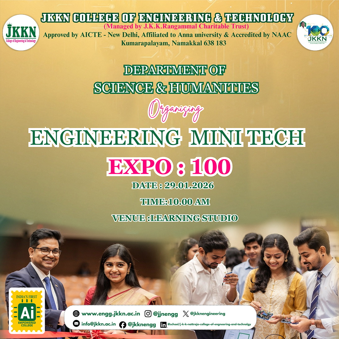This expo serves as a dynamic platform for students to showcase 100 innovative engineering ideas and mini projects, reflecting creativity, technical knowledge, and problem-solving skills. The event aims to encourage interdisciplinary learning, hands-on innovation, and real-world application of engineering concepts. Faculty members, students, and technology enthusiasts are invited to witness young minds transforming ideas into impactful solutions and celebrating the spirit of engineering innovation.